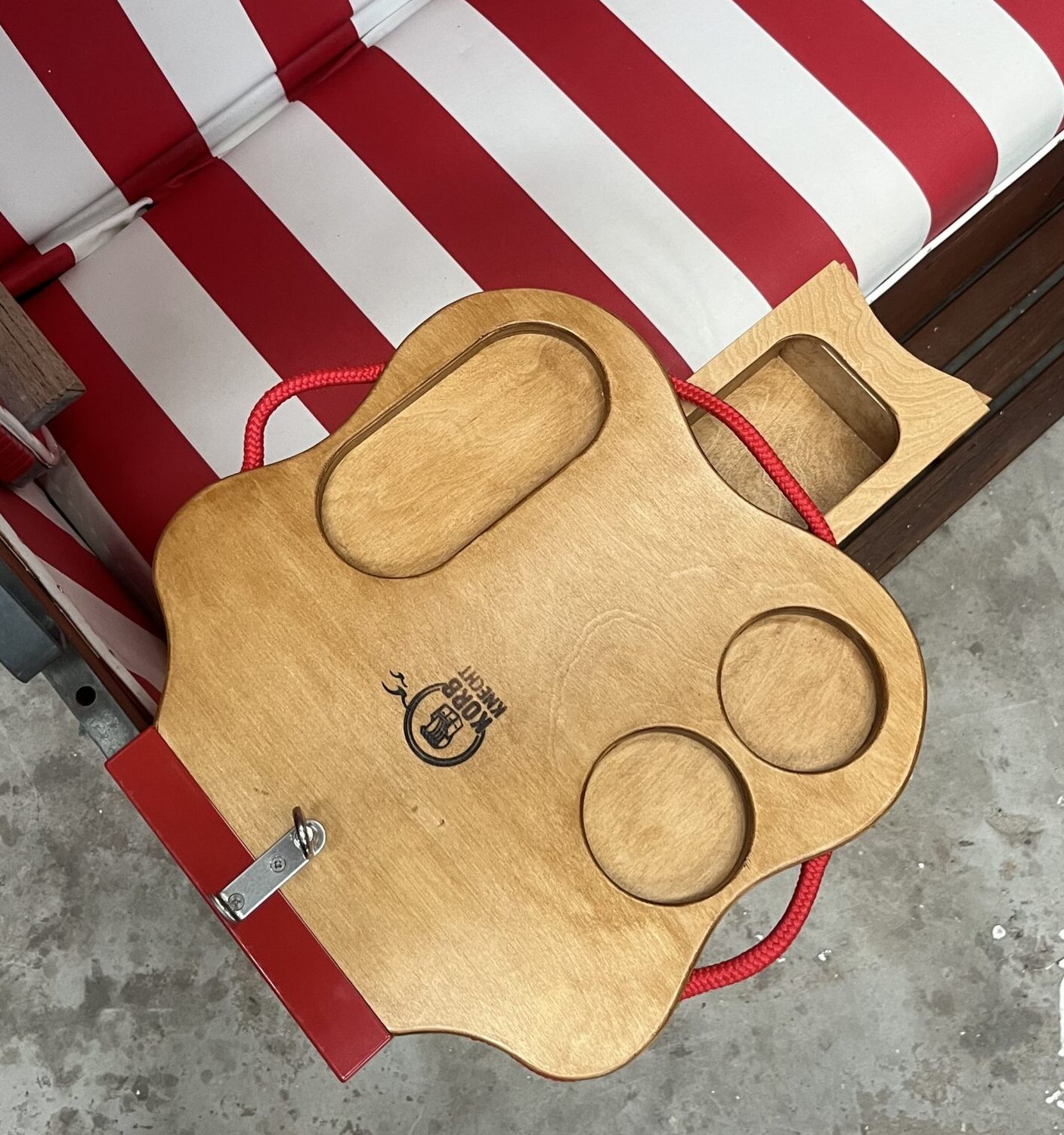 Die Körbe haben zwei Klapptische, bezogene Fußrasten, die Polster sind mit einer strapazierfähigen, abwaschbaren Kunststofffolie bezogen.